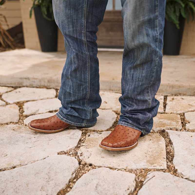 Complete with a genuine full-quill ostrich foot with full-grain leather shaft, genuine ostrich underlay in pull straps, leather lining and a cushion flex insole with rigid rear foot stabilizer. This style also has a nylon shank, rolled shank area, hand pegged and nailed genuine leather outsole, ¾ genuine Goodyear® welt construction, genuine leather welt with double row cotton stitch and a high-abrasion resistant rubber heel lift. This style is finished off with a 1 ¼” stockman with a Rocker heel and square toe.