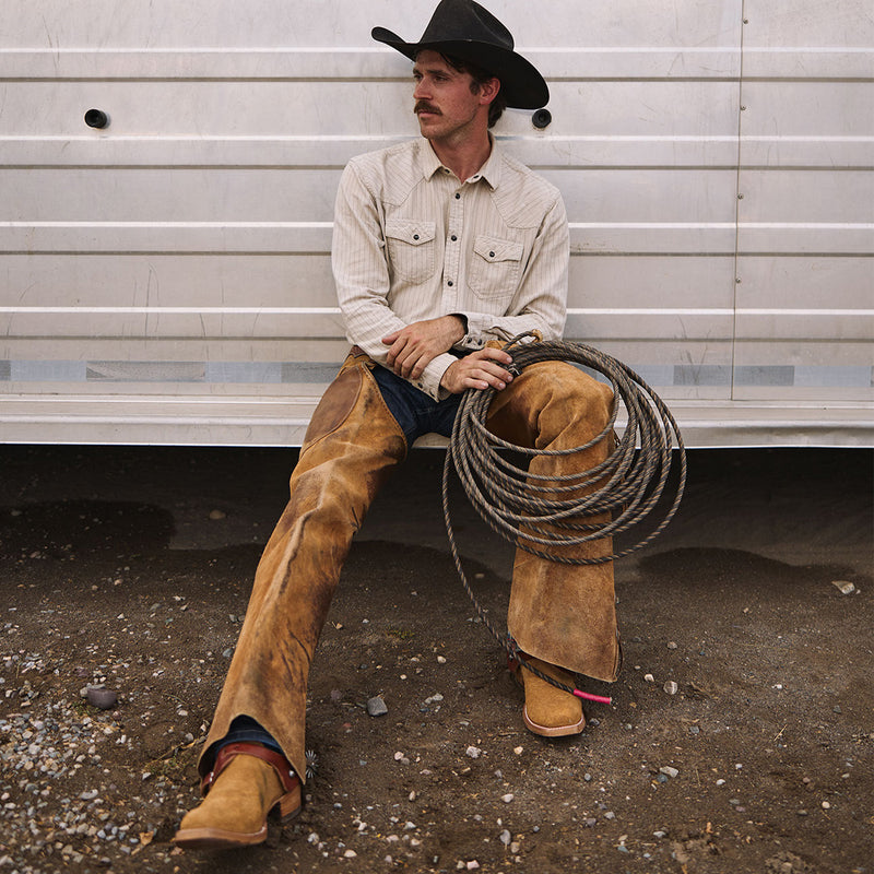 Man in cowboy attire sitting on a trailer holding a coiled rope wearing western boots.
